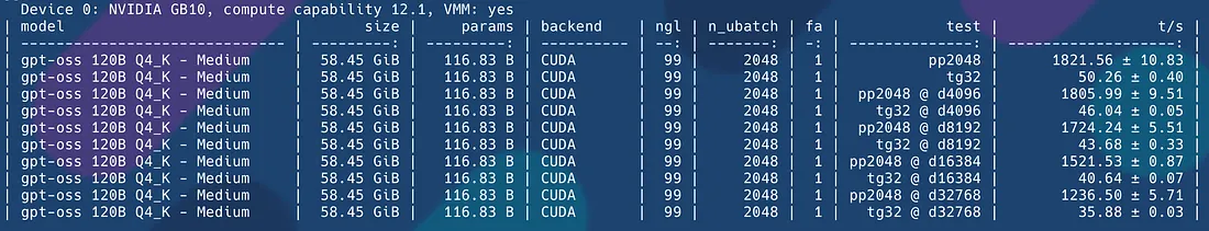 Az alábbi eredmények a „pp” („pre-fill”, más néven „prompt processing”, azaz az LLM-kérés kezdeti, számításigényes szakasza) és a „tg” értékeket mutatják, amely utóbbi a gpt-oss-20B modell esetében másodpercenként generált válasz tokenek számát jelenti: