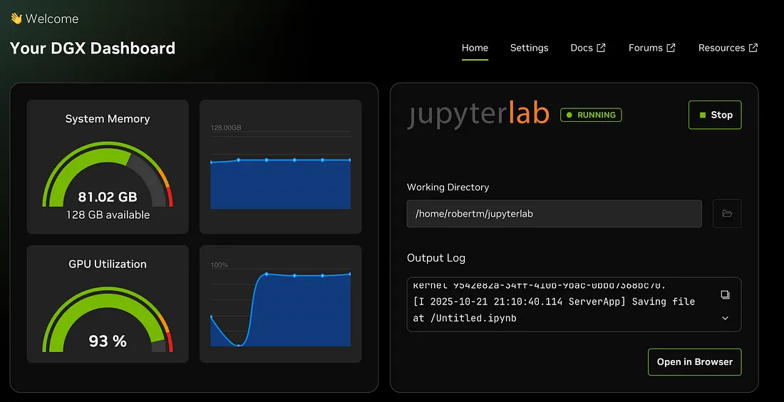 A DGX Dashboard megnyitásával távolról figyelemmel kísérheted a Spark RAM- és GPU-használatát, valamint megnyithatsz egy JupyterLab notebook munkamenetet a Sparkon: